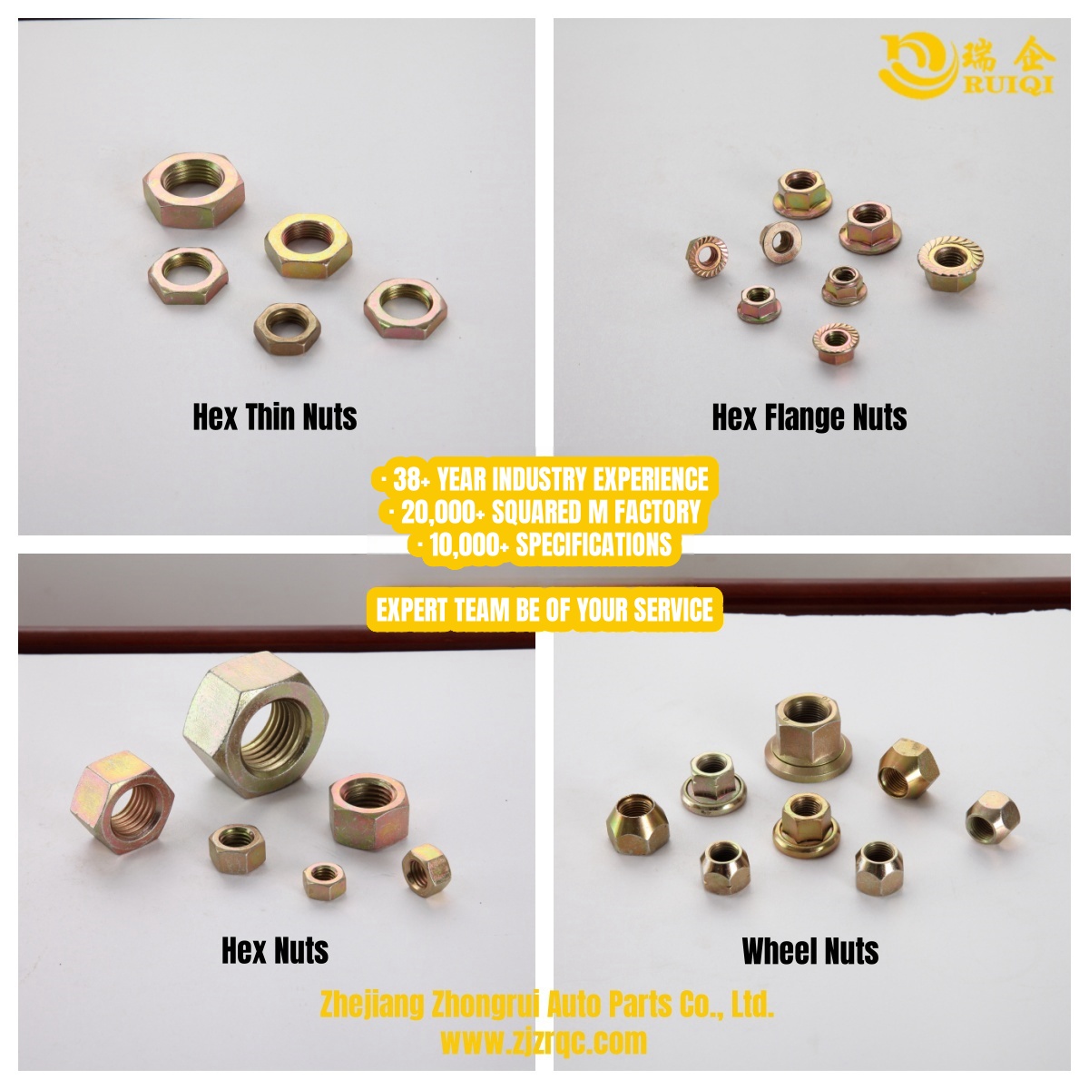 Zhejiang Zhongrui bildelar, med över 38 års branschkompetens, presenterar stolt ett omfattande utbud av högkvalitativa nötter. Vår toppmoderna 20 000 kvadratmeternas fabrik och en omfattande katalog med över 10 000 specifikationer säkerställer att vi kan tillgodose alla dina fästbehov.