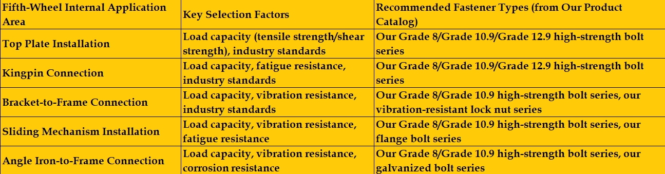 Femtehjulssystemet spelar en avgörande roll i att ansluta traktorn och trailern, vilket är viktigt för säker och effektiv transport. Att välja lämpliga fästelement är avgörande för integriteten och livslängden för denna anslutning, vilket direkt påverkar säkerheten och den operativa tillförlitligheten. Detta nyhetsbrev syftar till att vägleda kunder, baserat på vårt företags produktkatalog, genom de viktigaste faktorerna att tänka på när du väljer fästelement för femte hjulapplikationer.